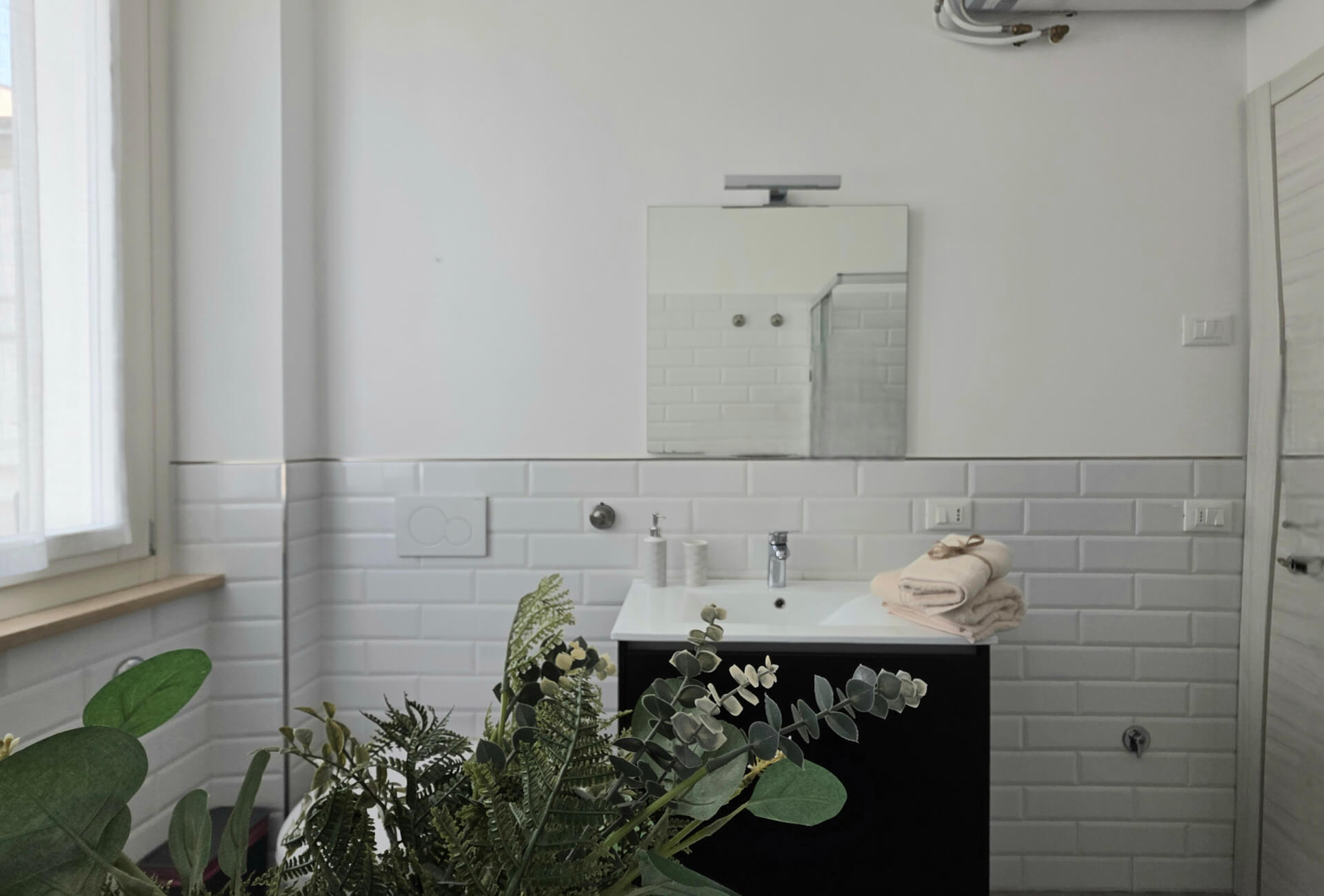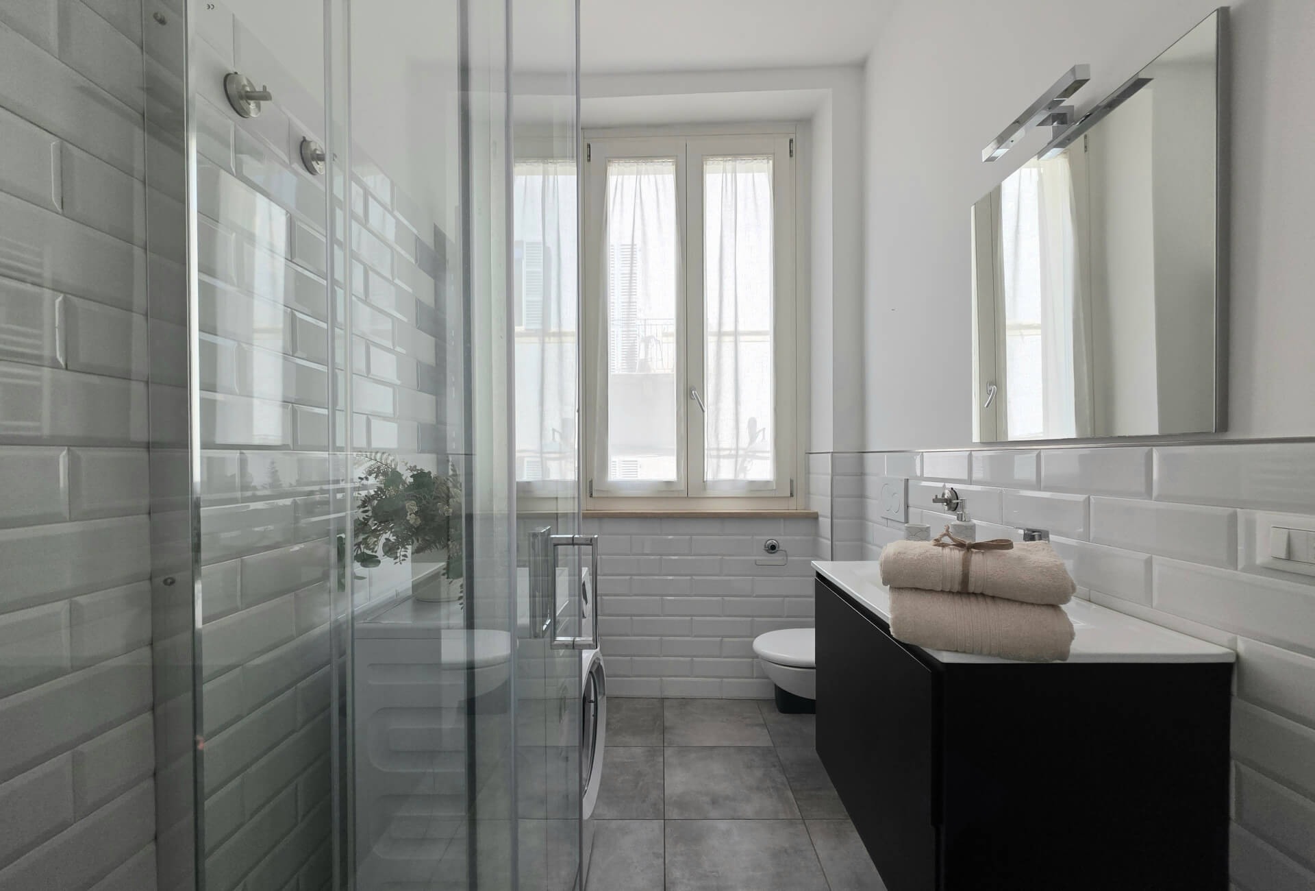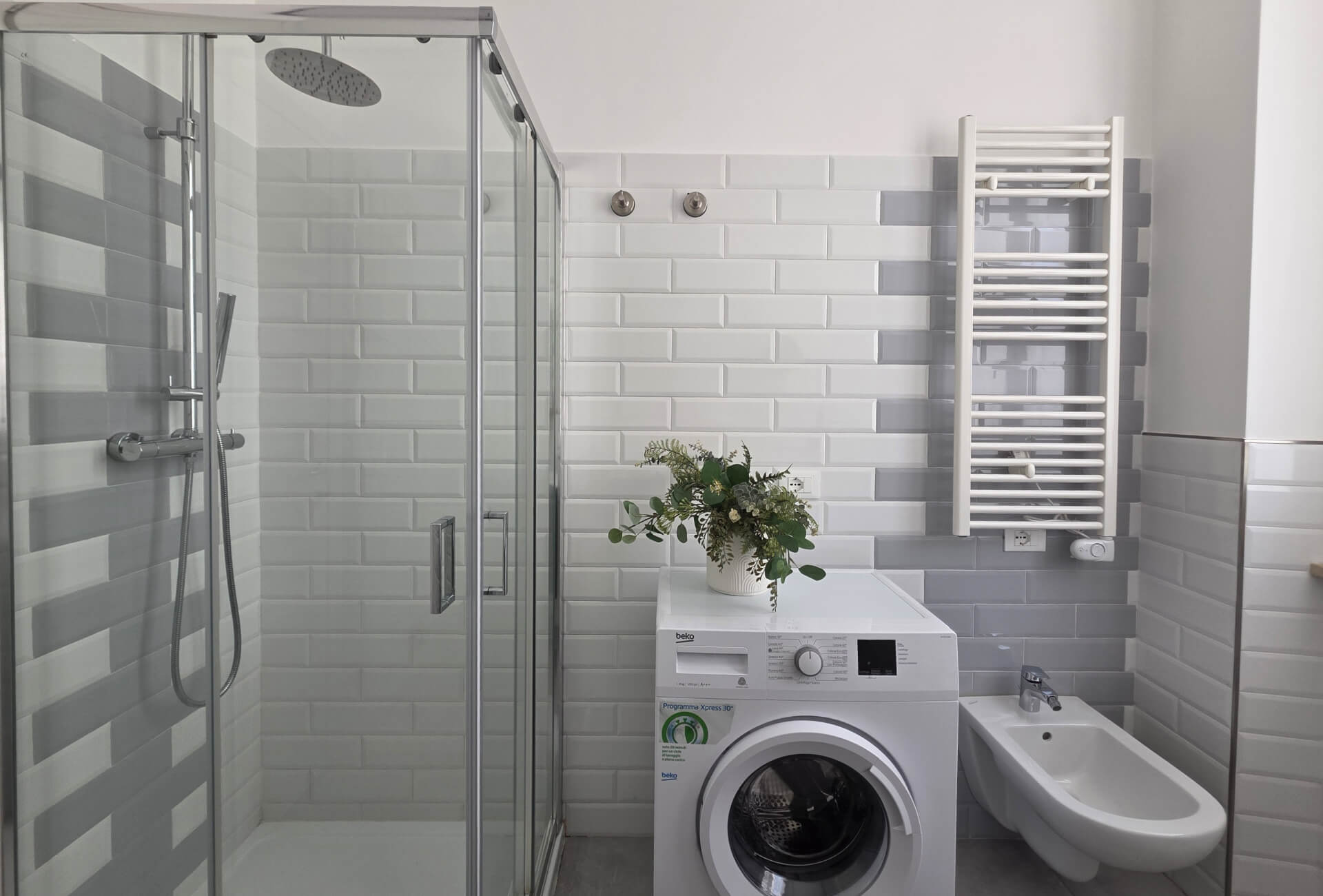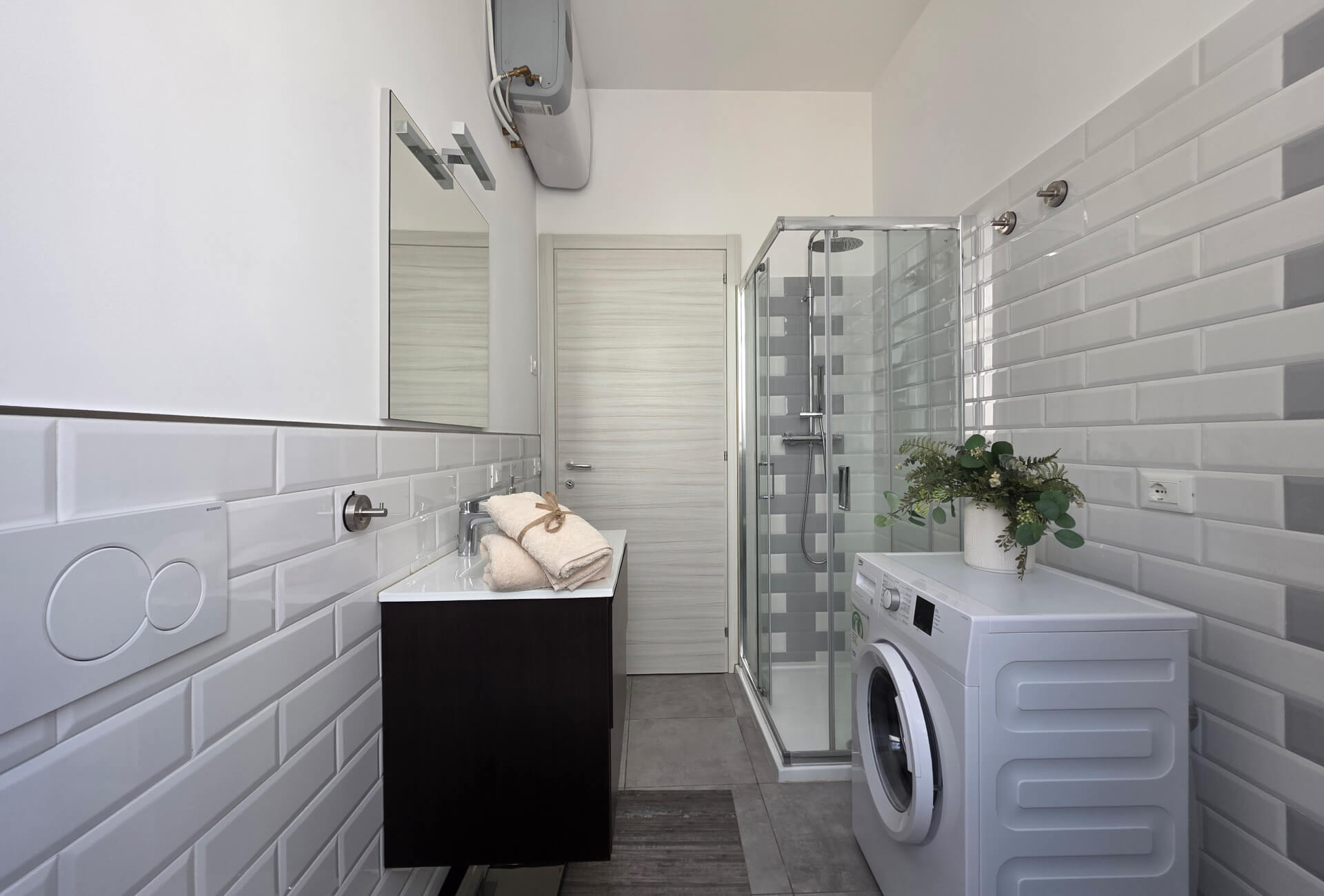 Il bagno è composto da un comodo lavabo con ampio specchio, un water ed un bidet, una comodissima doccia ed una lavatrice.